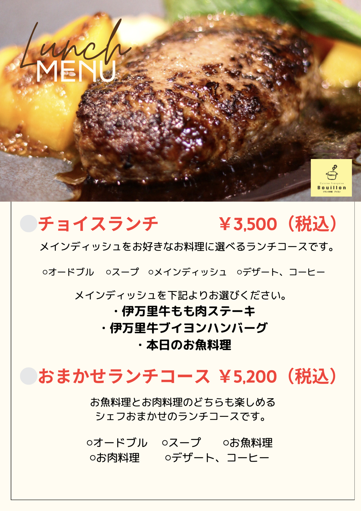 一番の人気のランチは、メインが伊万里牛ステーキか伊万里牛ハンバーグかお魚の好きな料理を選べるチョイスランチです。オードブル、スープ、デザートも付いてお得な内容となってます。