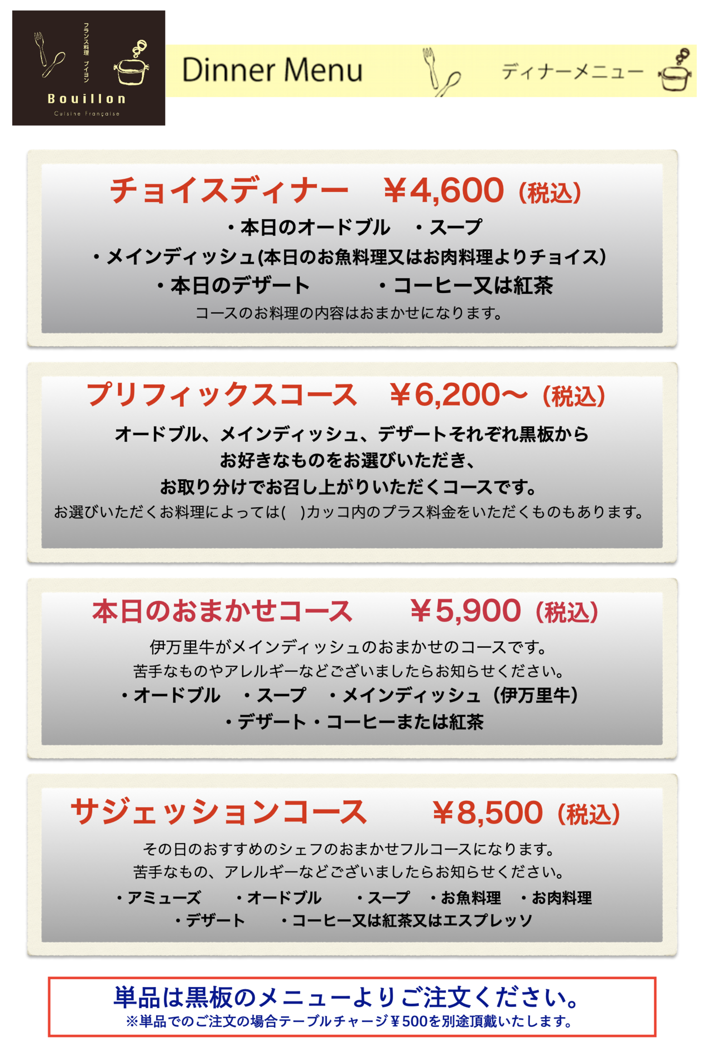 夜のディナーは選べるコースとお任せのコースの4種類をご用意しております。