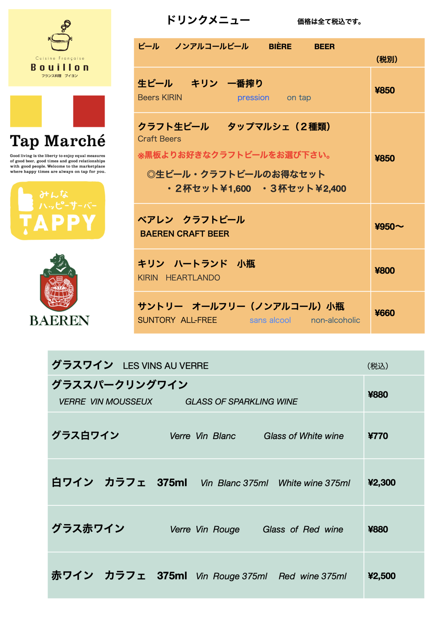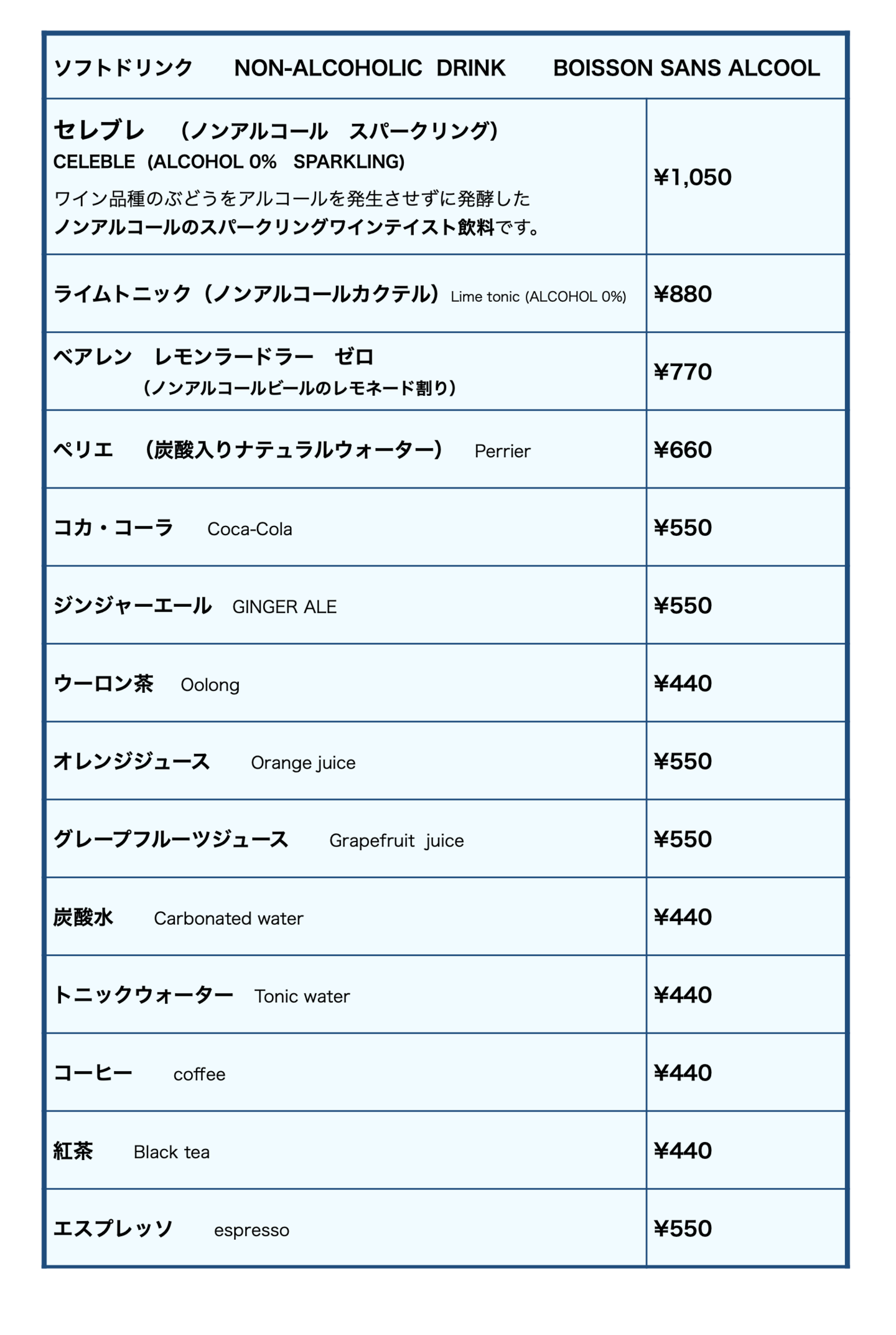 ※上記メニュー以外にもカクテル、食前酒などもご用意しております。
